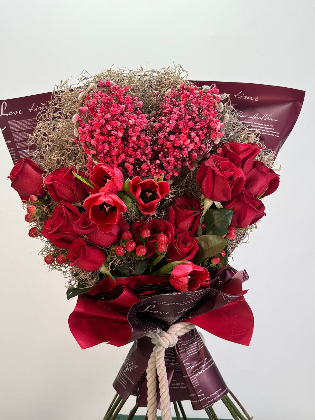An elegant, romantic bouquet featuring premium red roses, red tulips, and delicate heart-shaped floral accents, hand-wrapped with a refined finish. Designed to express deep love and make any special moment unforgettable.